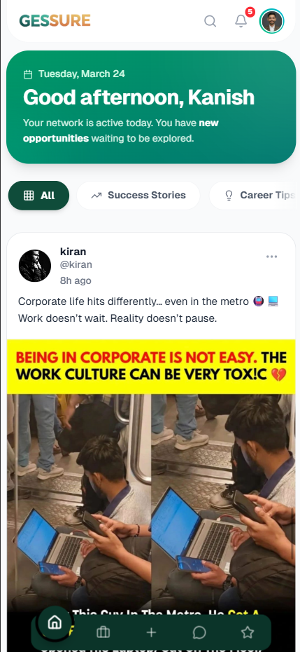 A powerful platform bridging the gap between LinkedIn-style networking and Naukri-style job discovery to help users hire, connect, and grow careers.